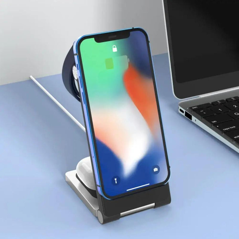 Triple charging, one elegant unit Instead of juggling multiple chargers, this device blends three wireless coils into one foldable form—phone, watch, and earbuds all get charged at once.